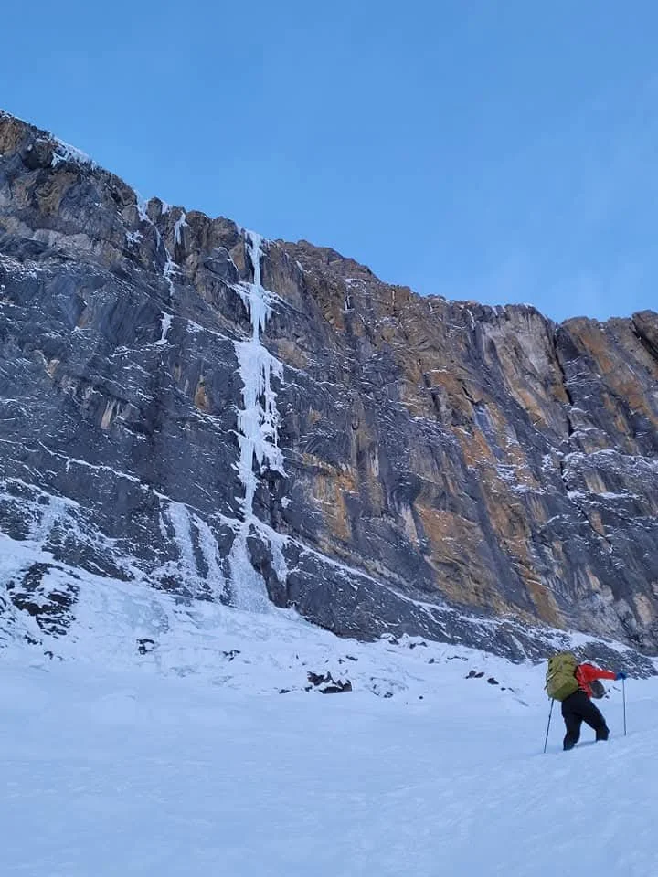 Katana was spotted from the road while driving, and it immediately became an obsession. The East aspect and very thin pillars meant it was not going to last long, and being visible from the car meant other peple had seen it too. The day started with many red flags, a questionable large snow slope, a near fall while soloing the approach, a broken pick with no replacement, a pair of fat pants lost to the wind, and severe misdjudging of the first pitch. Leaving the rock rack behind on that first pitch made it very serious, a bold and dangerous lead by Dylan. We rallied at every setback and everyone climbed it clean, with Stas leading the crazy 3rd pitch. It had a 2 inch crack half way up, and a very thin aerated bottom, the first screw at 30m, overall a horrifying, precarious feature. Every pitch was WI6 or harder, we gave the 2nd pitch 5+ because relative to the others it was easier. Taken as a single separate pitch it’s a 6. Hopefully this gem forms again and gets repeated.